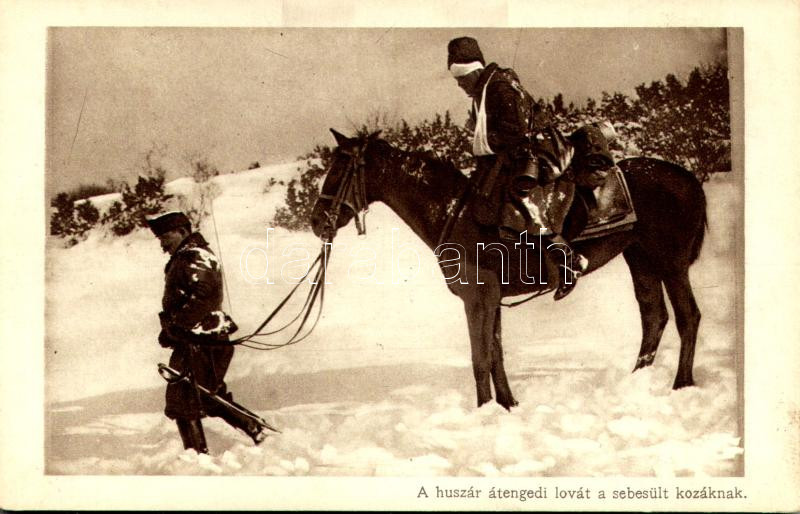A huszár átengedi lovát a sebesült kozáknak. Az Érdekes Újság kiadása / WWI Austro-Hungarian K.u.K. military, hussar passes his horse to the wounded Cossack