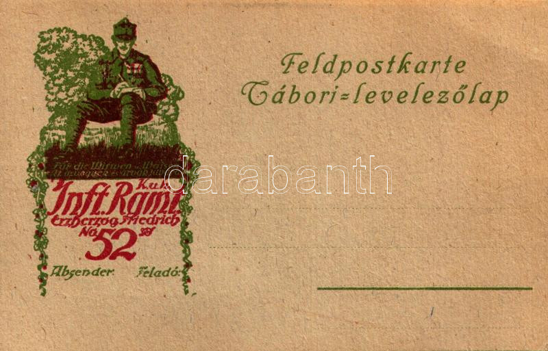 K.u.K. Inft. Rgmt. Erzherzog Friedrich No. 52. Feldpostkarte / Tábori Postai Levelezőlap az özvegyek és árvák javára / WWI Austro-Hungarian K.u.K. military field postcard (EB)