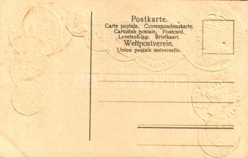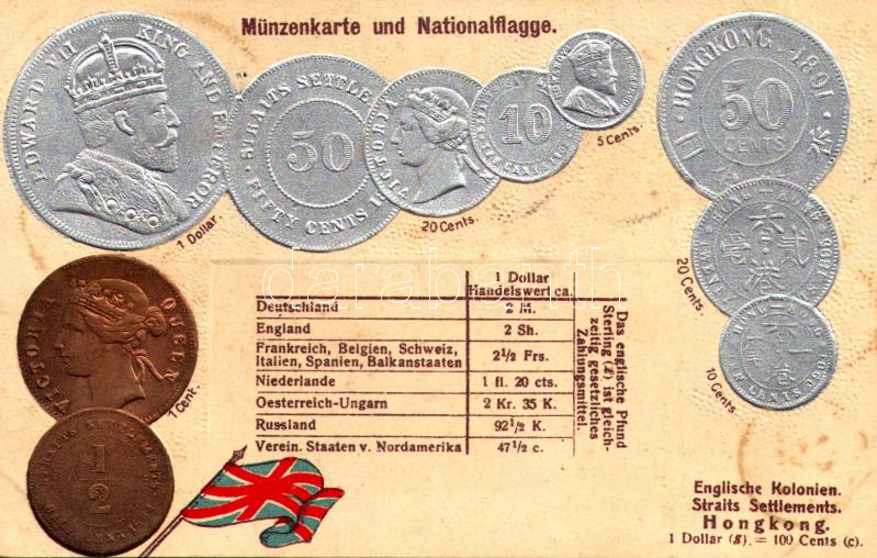 Englische Kolonien, Straits Settlements, Hongkong. Münzenkarte und Nationalflagge / British Colonies - set of coins, currency exchange chart and flag. Emb. litho (lyuk / pinhole)