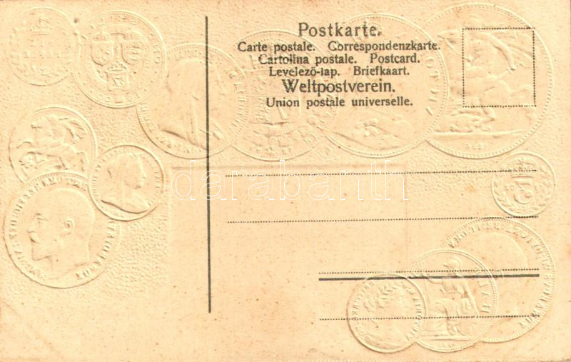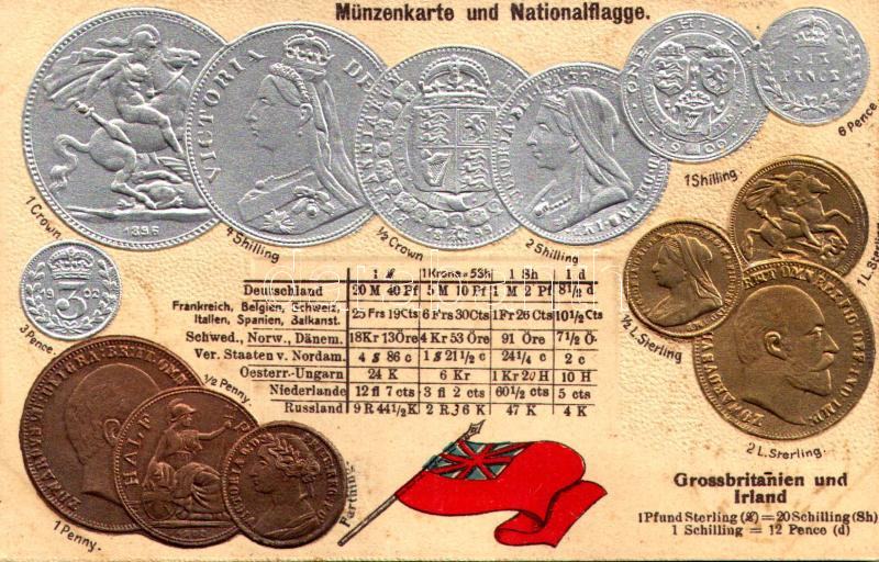 Grossbritanien und Irland. Münzenkarte und Nationalflagge / Great Britain and Ireland - set of coins, currency exchange chart and flag. Emb. litho (lyuk / pinhole)