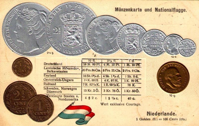 Beschreibung: Niederlande. Münzenkarte und Nationalflagge / Netherlands - set of coins, currency exchange chart and flag. Emb. litho (lyuk / pinhole)