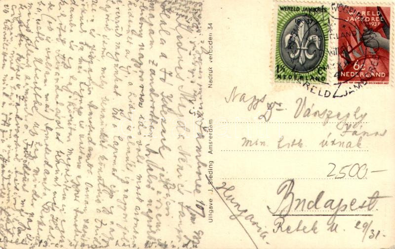 Beschreibung: 1937 H.M. de Koningin, Lord Baden Powell (links) en Staatsraad J.J. Rambonnet bij de officieele opening der Wereld Jamboree / 5. Cserkész Világdzsembori megnyitója Hollandiában, Vilma holland királynő, Jean Jacques Rambonnet / 5th World Scout Jamboree's opening ceremony in the Netherlands + So. Stpl