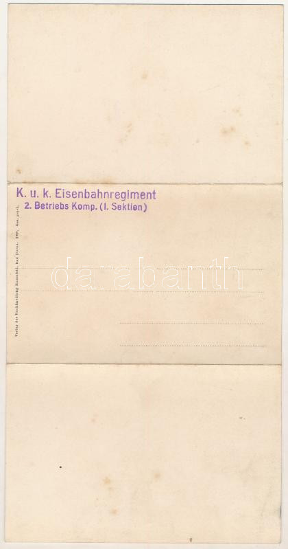 Beschreibung: Vatra Dornei, Dornavátra, Bad Dorna-Watra (Bukovina, Bucovina, Bukowina); Herrengasse / street view with church and Bahn Hotel. 3-tiled folding panoramacard + "K.u.K. Eisenbahnregiment 2. Betriebs Komp. (I. Sektion)" (fl)