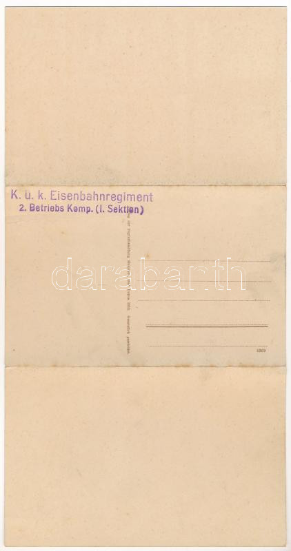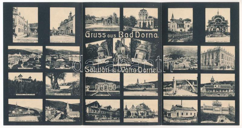 Vatra Dornei, Dornavátra, Bad Dorna-Watra (Bukovina, Bucovina, Bukowina); K. K. Post und Telegraphenamt, Mikuligasse, Hauptstraße, Arkadiaquelle, Johannisquelle, Willa Terlifaj, Musikpavillon, Totalansicht, Amalia-Brunnen, Falkenhainquelle, Tempel, Runc-Pavillon, Kurhaus u. Kurparkhotel, Bahnhotel, Badeanstalt, Brücke über die Dorna, Station Bad Dorna, Kathol. Kirche, Waldparkhotel, Städtisches Elektrizitätswerk, Wasserreservoir / multi-view postcard with synagogue, villa, hotels, mineral water springs, bridge, electric power plant, railway station, etc. 3-tiled folding panoramacard + "K.u.K. Eisenbahnregiment 2. Betriebs Komp. (I. Sektion)" (fa)