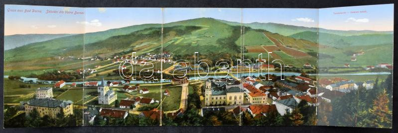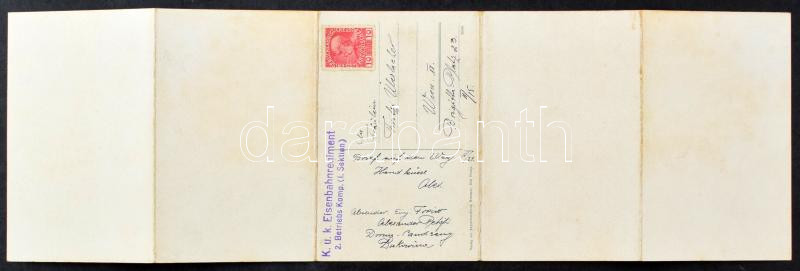 Beschreibung: Vatra Dornei, Dornavátra, Bad Dorna-Watra (Bukovina, Bucovina, Bukowina); Totalansicht / Vederea totala / 5-tiled folding panoramacard + "K.u.K. Eisenbahnregiment 2. Betriebs Komp. (I. Sektion)"