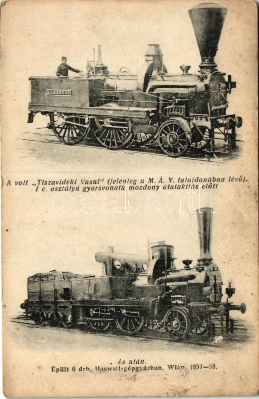 A volt "Tiszavidéki Vasút" (jelenleg a MÁV tulajdonában lévő) 1.c. osztályú "Harangod" gyorsvonatú mozdony átalakítás előtt és után. Épült 6 db Haswell gépgyárban, Wien. Gőzmozdony Vasút és Erőgép Szaklap kiadása / Hungarian State Railways locomotive (felületi sérülés / surface damage)