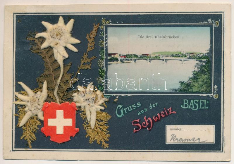 1909 Basel, Die drei Rheinbrücken. Gruss aus der Schweiz / bridges. Art Nouveau, Floral frame with real dried Edelweiss flower and Swiss coat of arms (Rb)