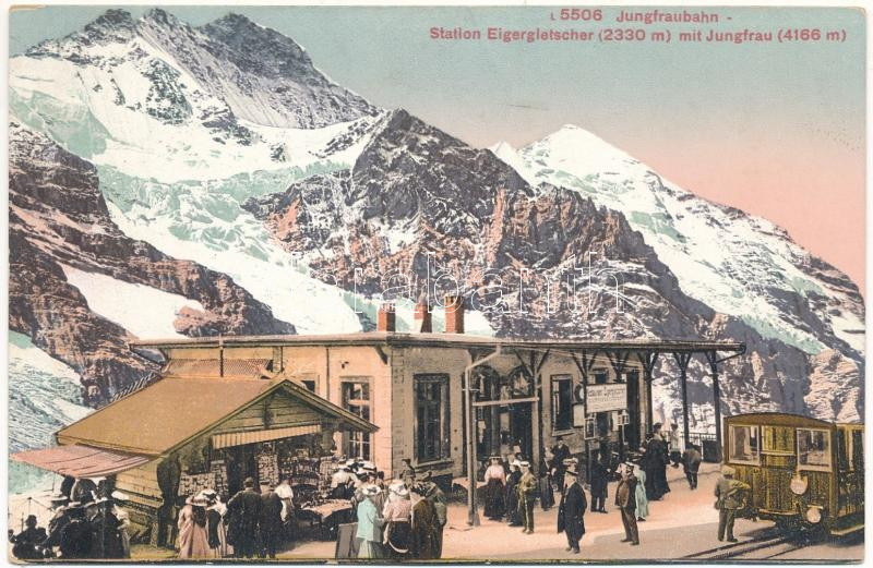 Jungfraubahn, Station Eigergletscher mit Jungfrau / mountain rack rail... https://www.darabanth.com/de/471-Fernauktion/471.0/Ansichtskarten/Schweiz~2000090/Jungfraubahn-Station-Eigergletscher-mit-Jungfrau-mountain-rack-railway-station-train-fl~II3188421