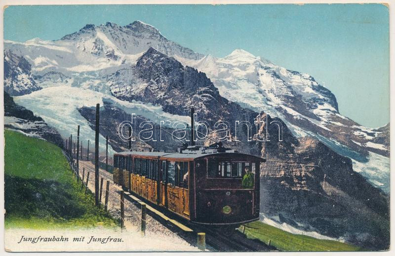 Jungfraubahn mit Jungfrau / mountain rack railway, train (wet damage) https://www.darabanth.com/de/471-Fernauktion/471.0/Ansichtskarten/Schweiz~2000090/Jungfraubahn-mit-Jungfrau-mountain-rack-railway-train-wet-damage~II3188423