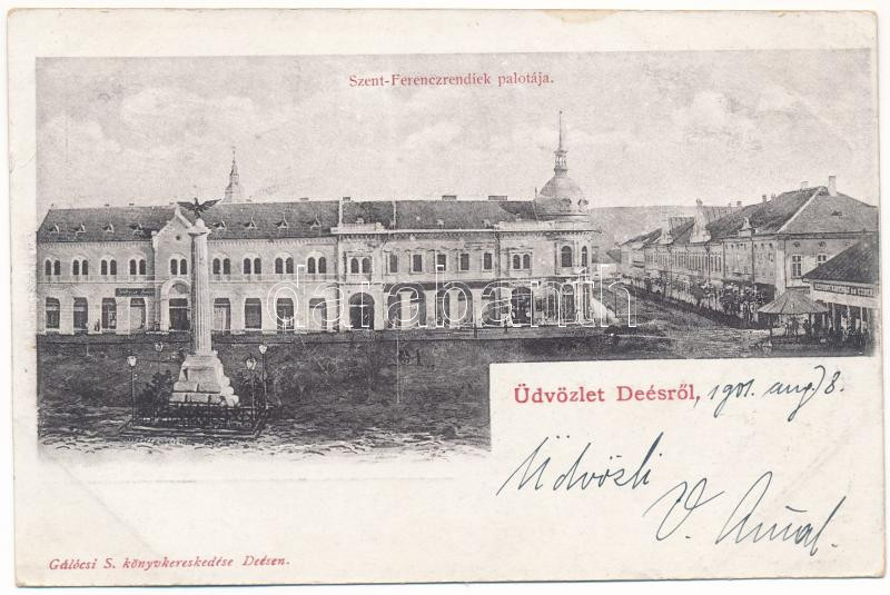 1901 Dés, Dej; Szent Ferencrendiek palotája, Központi kávéház és cukrászda, Milleniumi szobor, Gálócsi Samu üzlete és saját kiadása / palace, cafe and confectionery, shops, monument (EB)