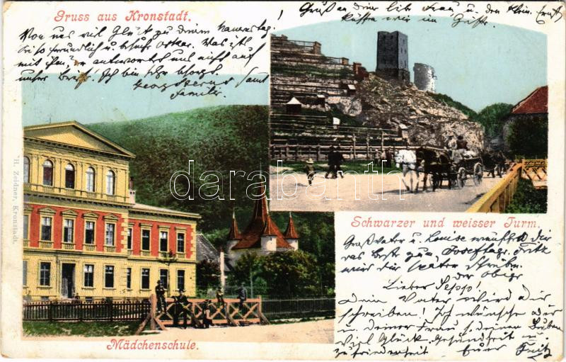 1904 Brassó, Kronstadt, Brasov; Mädchenschule, Schwarzer und weisser Turm / Leány iskola, Fekete és fehér torony. H. Zeidner kiadása / girl school, towers (Rb)