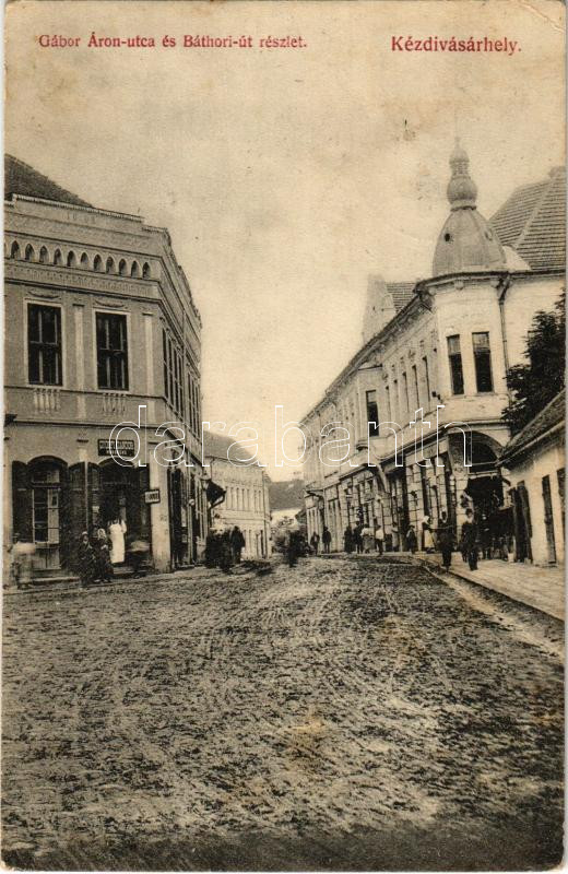 1912 Kézdivásárhely, Targu Secuiesc; Gábor Áron utca és Báthori út részlet, Győrfi Sándor hússzéke, üzletek. Turóczi István kiadása / streets, butcher shop, shops (EK)