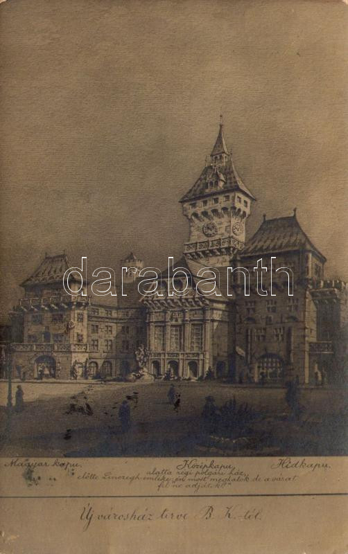 1913 Kolozsvár, Cluj; Az új városháza terve, Magyar kapu, Középkapu alatta régi polgári ház, előtte Linczegh emléke, Hídkapu / plans for the new town hall. photo (fl)