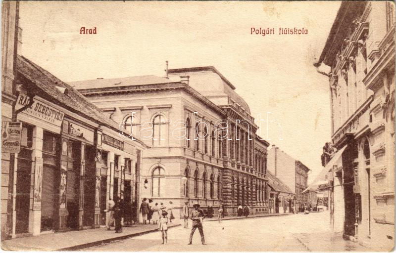 1914 Arad, Polgári fiú iskola, Rácz Sebestyén hentes üzlete, Seiler Bertalan és Várhol László üzlete. Ifj. Klein Mór kiadása / boy school, shops, butcher (EK)