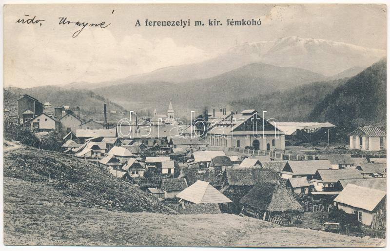 Beschreibung: 1915 Fernezely, Felsőfernezely, Firiza (Nagybánya, Baia Mare); M. kir. fémkohó, bánya. Kovács Gyula kiadása / metal factory, works, mine (EK)