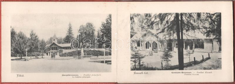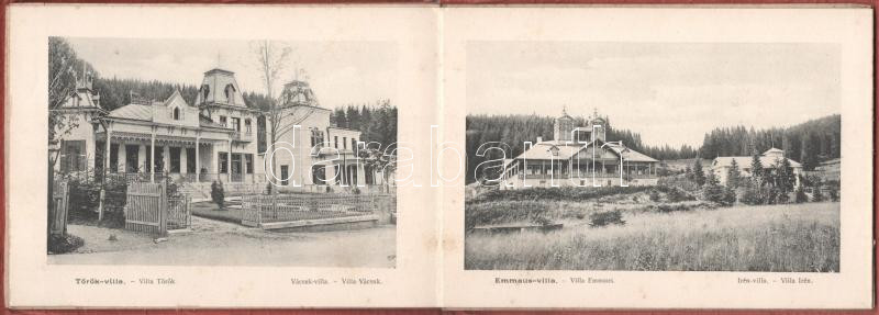 Borszék, Borsec; Heiter György fényképész kiadása Szászrégen - nem képeslapos leporello füzet 15 képpel: Főkút, Kossuth kút, Főherceg József kút, székház, Lobogó-fürdő, Remény szálloda, Török, Emmaus, Vácsuk, Irén, Urmánczy, Pose, Bellevue, Dr. Szini, Csíki és Excelsior villa, Mélik szálloda, medve barlang / non-postcard leporello booklet with 15 pictures: hotel, villas, cave, spa, springs