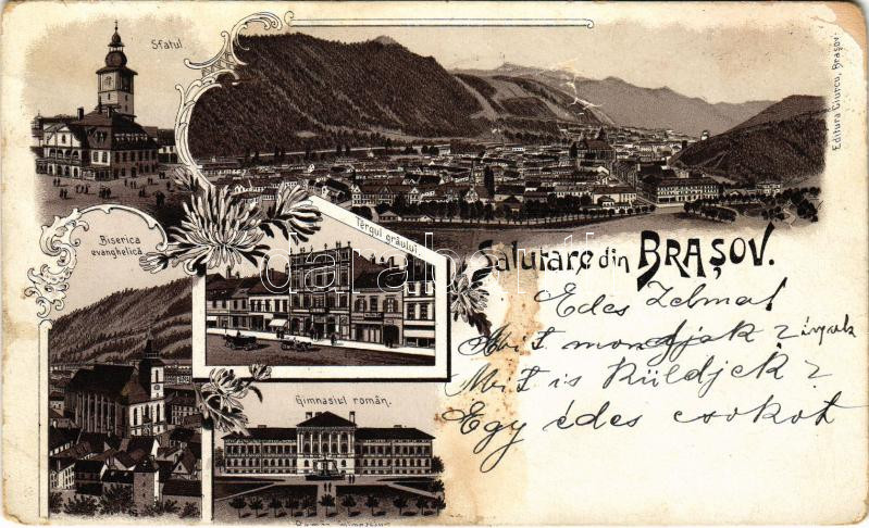 Brassó, Kronstadt, Brasov; Sfatul, Tergul graului, Gimnasiul roman, Biserica evanghelica / látkép, városháza, Evangélikus templom, Román gimnázium, Búzapiac / general view, town hall, Lutheran church, Romanian grammar school, market row. Art Nouveau montage, floral, litho (Rb)