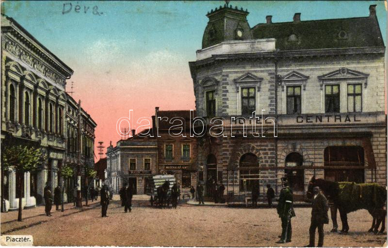 Déva, Deva; Piac tér, Hotel Central szálloda és kávéház, Baum Mór, Maschalkó János üzlete. Hirsch Adolf kiadása / market square, hotel, café, shops (fl)