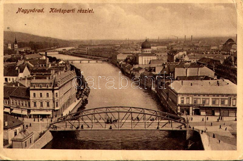 Nagyvárad, Oradea; Körösparti részlet, híd, zsinagóga, Gazdasági és Iparbank, Flegman Ármin üzlete / Cris riverside, bridge, bank, synagogue, shop (szakadás / tear)