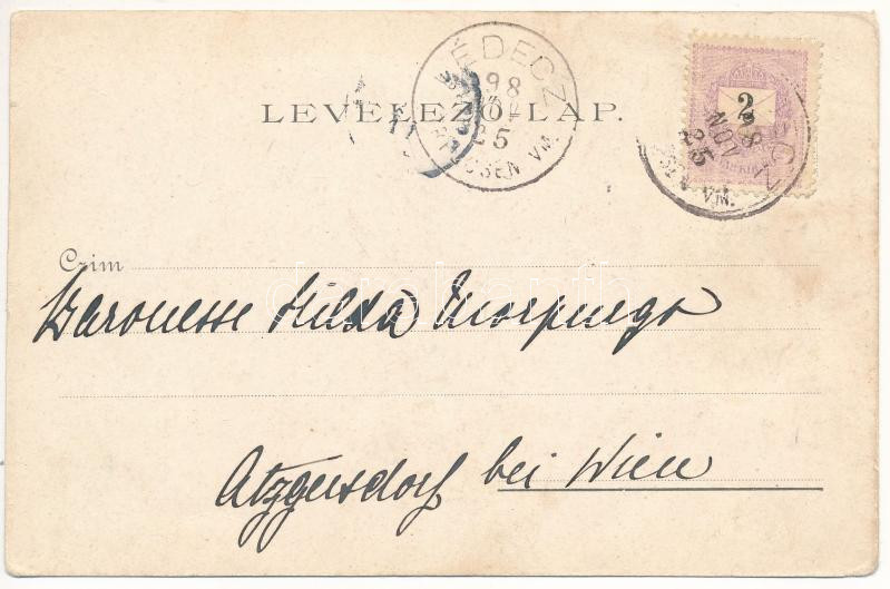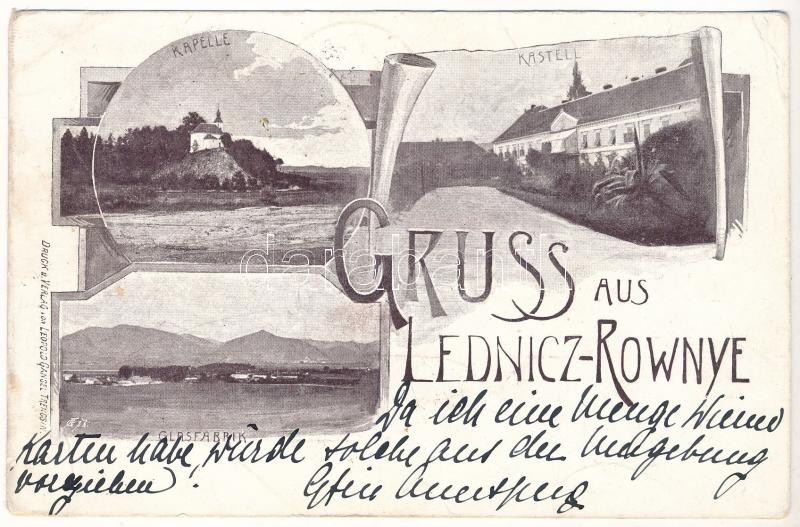 1898 (Vorläufer) Lednicróna, Lednicz-Rovne, Lednicz-Rownye, Lednické Rovne; Kapelle, Kastell, Glasfabrik / Kápolna, Rákóczi kastély, üveggyár / chapel, castle, glassworks, glass factory. Leopold Gansel Art Nouveau, floral (EB)