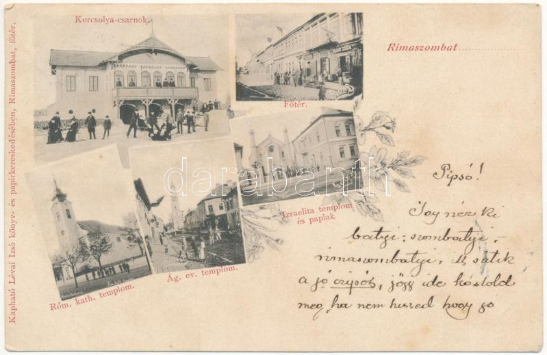 1899 (Vorläufer) Rimaszombat, Rimavska Sobota; Korcsolya csarnok, Fő tér, Ágostai evangélikus és római katolikus templom, izraelita templom és paplak, zsinagóga, Braun Zsigmond üzlete / ice skating hall, main square, churches, synagogue, shop. floral (EK)