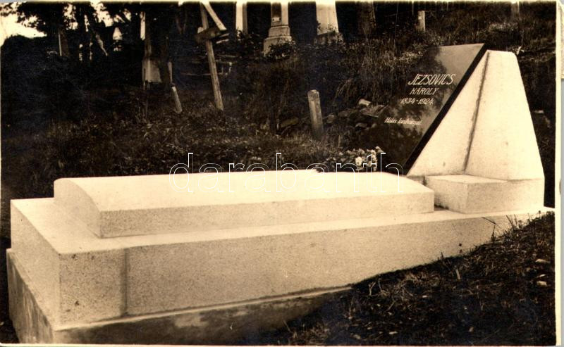 1928 Selmecbánya, Banská Stiavnica; Jezsovics Károly (1834-1924) a selmecbányai evangélikus líceum nyugalmazott igazgatója síremléke az evangélikus temetőben / the tombstone of Károly Jezsovics, retired director of the Lutheran Lyceum, in the Lutheran cemetery. photo (vágott / cut)