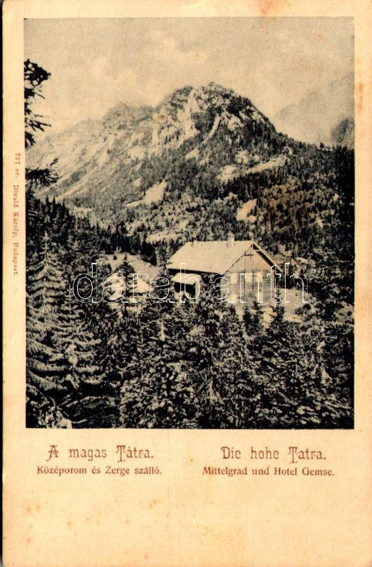 Tátra, Magas-Tátra, Vysoké Tatry; Középorom és Zerge szálló. Divald Ká... https://www.darabanth.com/de/471-Fernauktion/471.0/Ansichtskarten/Slowakei~2000007/Tatra-Magas-Tatra-Vysoke-Tatry-Kozeporom-es-Zerge-szallo-Divald-Karoly-327-sz-Mitte~II3186466