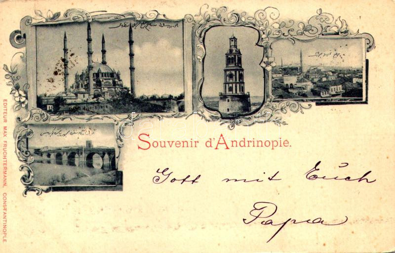 Beschreibung: 1899 (Vorläufer) Edirne, Andrinople; mosque, clock tower, general view, bridge. Editeur Max Fruchtermann. Art Nouveau, floral (fl)