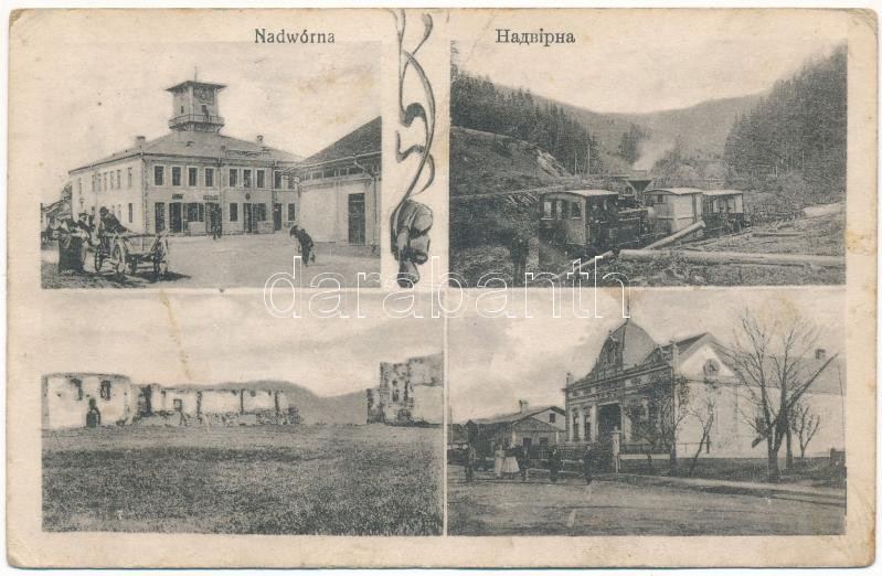 1916 Nadvirna, Nadwirna, Nadwórna; ul. Stanislawowska, Ratusz, Ruiny zamku. Nakladem J. Orenstein / street, town hall, castle ruins, industrial railway, locomotive, train. Art Nouveau (fa)