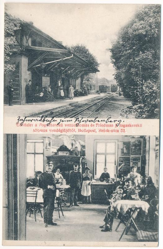 Beschreibung: 1909 Budapest II. Fogaskerekű vasútállomás és Friedman J. fogaskerekű állomás vendéglője, étterem belső vasutassal. Retek utca 52.