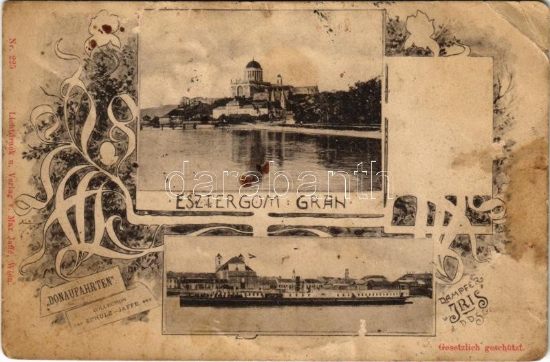 1917 Esztergom, "Iris" oldalkerekes gőzös Esztergomnál a Dunán / "Donaufahrten" An Bord des Dampfers "Iris" der DDSG, Esztergom (Gran). Lichtdruck u. Verlag v. Max Jaffé, Wien Nr. 225. / Austro-Hungarian sidewheeler steamship in Esztergom. Schulz-Jaffe Collection. Art Nouveau, floral (EB)