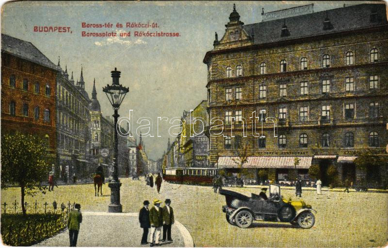 Budapest VIII. Baross tér és Rákóczi út, Központi szálloda, kávéház és étterem, Debreczen szálloda, üzletek, villamos, automobil (kopott sarkak / worn corners)