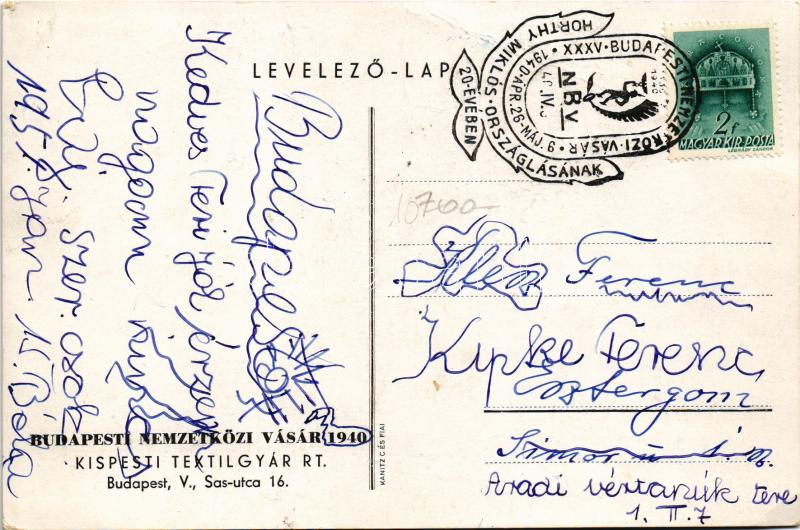 Beschreibung: Kistexx. Budapest Nemzetközi Vásár. Kispesti Textilgyár reklámlapja / Hungarian textile factory advertisement + "1940 XXXV. Budapesti Nemzetközi Vásár Horthy Miklós Országlásának 20. évében" So. Stpl. (fa)