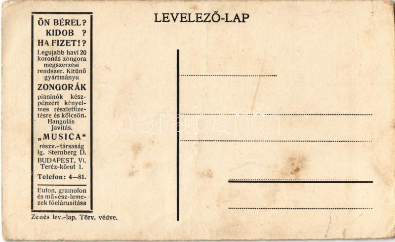 Van nekem szeretőm... Musica részvénytársaság kottás reklámja. Ig. Ste... https://www.darabanth.com/de/471-Fernauktion/471.0/Ansichtskarten/Werbungen~2000062/Van-nekem-szeretom-Musica-reszvenytarsasag-kottas-reklamja-Ig-Sternberg-D-Budapest-Ter~II3140567
