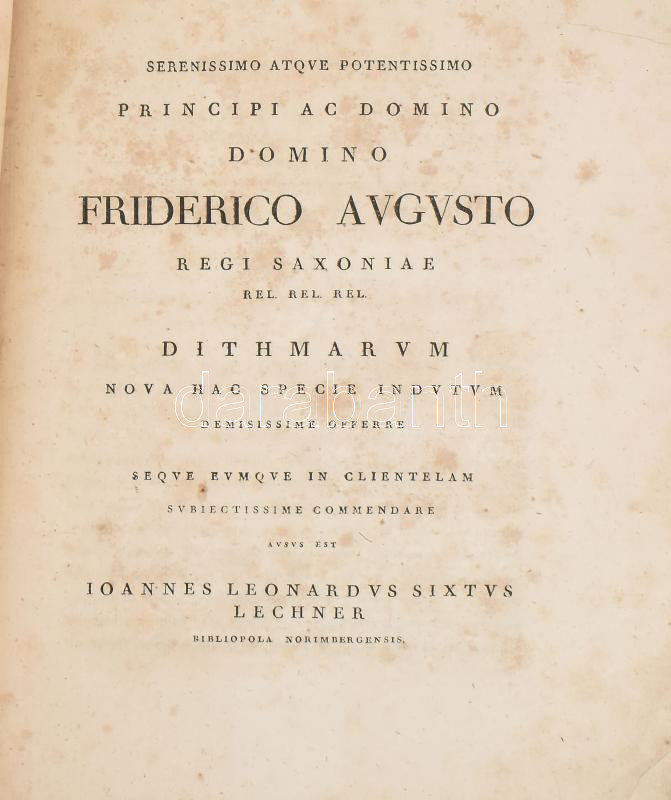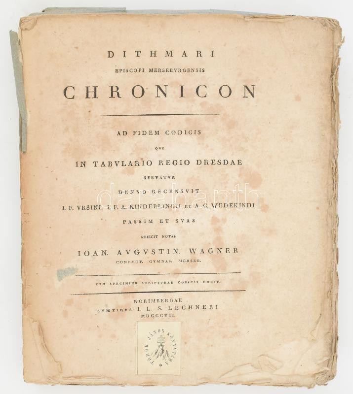 J. A. Wagner,: Dithmari Chronicon: Ad Fidem Codicis, Qui in Tabulario Regio Dresdae Servatur. Norimbergae, 1807. I. L. S. Lechneri. 505p + 1 t. Fűzve, hiányos papírborítóval. néhány lap sarka sérült.