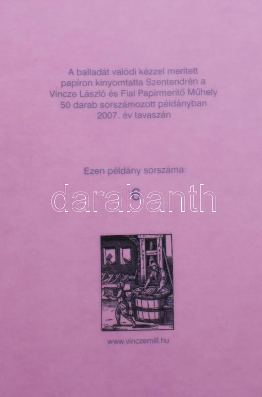 Arany János: A walesi bárdok. Szentendre, 2007, Vincze László és Fiai Papírmerítő Műhely. Kiadói harántalakú, zsinórfűzéses kötésben, merített papíron (31,5x67,5 cm). Megjelent 50 példányban, számozott (6./50). ,,A balladát valódi kézzel merített papíron kinyomtatta Szentendrén a Vincze László és Fiai Papírmerítő Műhely 50 darab sorszámozott példányban 2007. év tavaszán. Ezen példány sorszáma: 6."