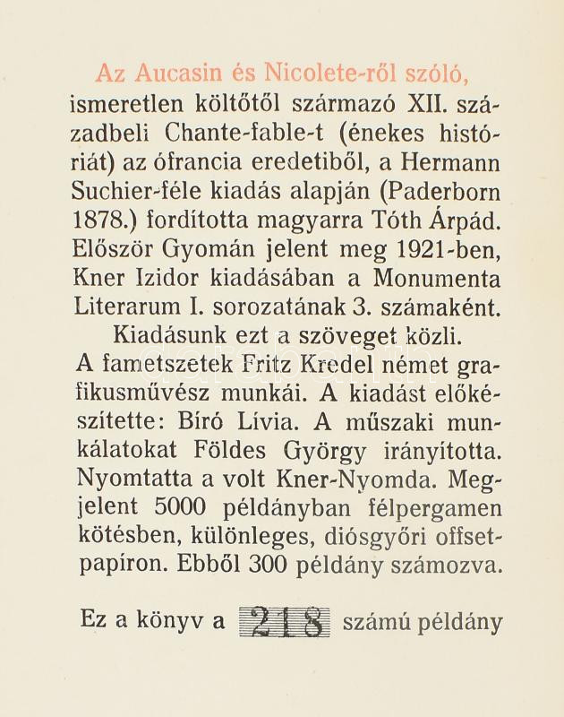 Aucasin és Nicolete. Ófrancia széphistória. Ford.: Tóth Árpád. Bp., 19... https://www.darabanth.com/de/471-Fernauktion/471.0/Bucher/Bucher-Andere-kuriositaten~1000037/Aucasin-es-Nicolete-Ofrancia-szephistoria-Ford-Toth-Arpad-Bp-1957-Magyar-Helikon-Gy~II3192943