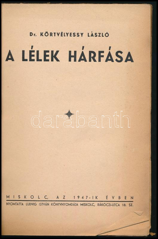Dr. Körtvélyessy László: A lélek hárfása. (Versek). Miskolc, 1947, Ludvig István-ny., 80 p. Kiadói illusztrált papírkötés, sérült borítóval, egy-két szamárfüles lappal, nagyrészt felvágatlan.