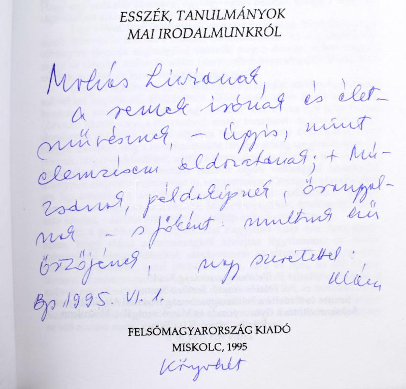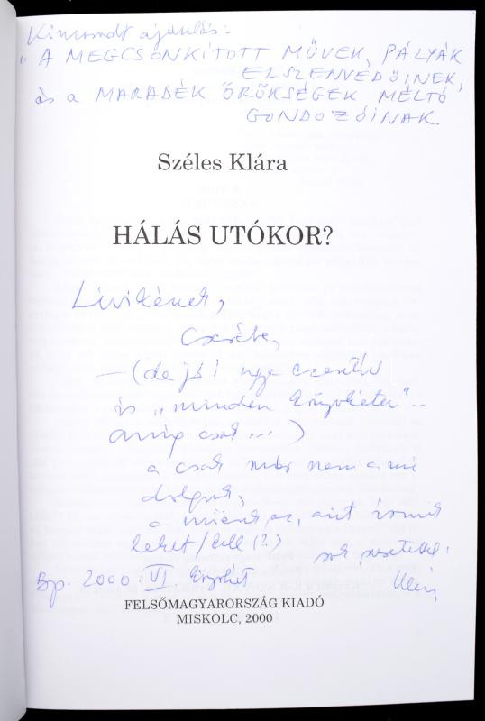 Széles Klára 3 műve. Mind a 3 a szerző, Széles Klára (1936-) irodalomtörténész, kritikus által Mohás Lívia (1928-2024) pszichológus, József Attila-díjas írónak DEDIKÁLT példány. Hálás utókor? Miskolc, 2000, Felsőmagyarország Kiadó. Kiadói papírkötés.; Henszlmann Imre művészetelmélete és kritikusi gyakorlata. Irodalomtörténeti Füzetek 126. sz. MTA Irodalomtudományi Intézete. Bp., 1992., Argumentum. Kiadói papírkötés.; A létté vált hiány. Esszék, tanulmányok mai irodalmunkról. Miskolc, 1995, Felsőmagyarország Kiadó. Kiadói papírkötés.;