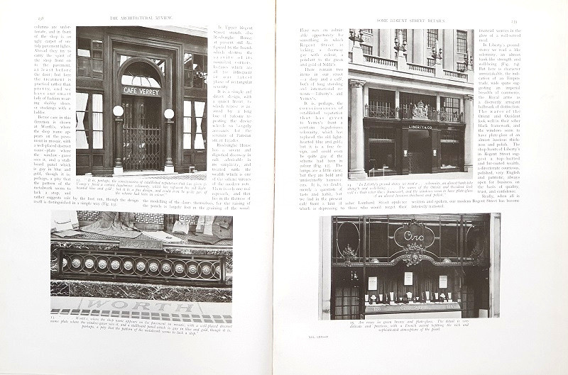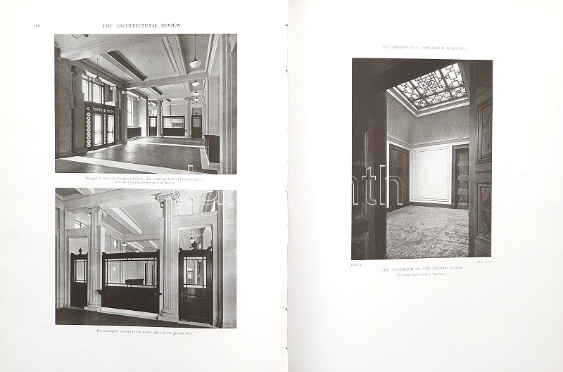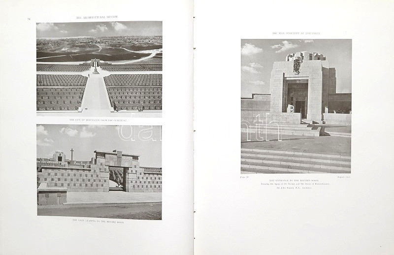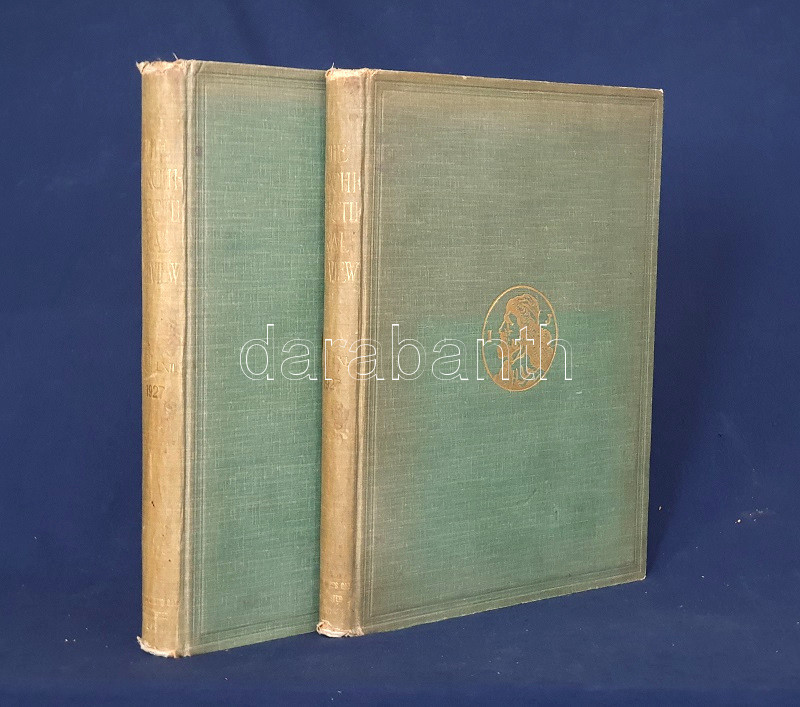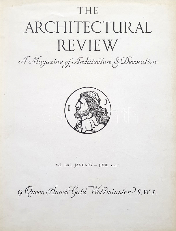 [Folyóirat] The Architectural Review. A Magazine of Architecture & Decoration. Vol. LXI - LXII (January - June 1927, July - December 1927). [Teljes évfolyam két kötetben.] (London), 1927. (Printed by Eyre & Spottiswoode Ltd.) VIII + 246 p. + 27 t. (3 színes); VII + [1] + 254 + [4] p. + 31 p. (3 színes). Folio. A ,,The Architectural Review" címen 1896-ban alapított építészeti, iparművészeti és urbanisztikai képes havi folyóirat a mai napig megjelenik. Rendkívül gazdag szövegközti fotóanyaggal ellátott magazinunk 1927-es évfolyama abban különbözik európai kortársaitól, hogy az építészeti modernizmus: az art deco / Bauhaus építészet esztétikája még kevésbé hatja át, az csak a későbbi évfolyamoktól válik erősebbé. Az Architectural Review angol szerkesztői és szerzői számára ugyanis kiemelten fontos hagyományt jelent a monumentális angol gótika, a Tudor-korabeli és György-korabeli építészet továbbélő hagyományainak megörökítése, így az organikus (társadalom)fejlődést szem előtt tartó szerkesztők kortárs épületfrontokat és épületterveket csak elvétve mutatnak be; art deco és Bauhaus-elemek jobbára csak a belsőépítészeti és ipari formatervezési anyagban tűnnek fel. A gazdagon illusztrált építészeti, iparművészeti és kertépítészeti esszék mellett önálló rovatot alkot az urbanisztika témája, ez azonban sokkal inkább a XIX. századi London történelmi városszerkezetét mutatja be, gazdag XIX. századi rajzanyag alapján (a Tallis' London Street View című rovatban). Modernista városközpontok, pályaudvarok urbanisztikája csak az 1930-as évektől mutatkozik a folyóirat hasábjain. Egységes, aranyozott kiadói egészvászon kötésben. Szép példány.