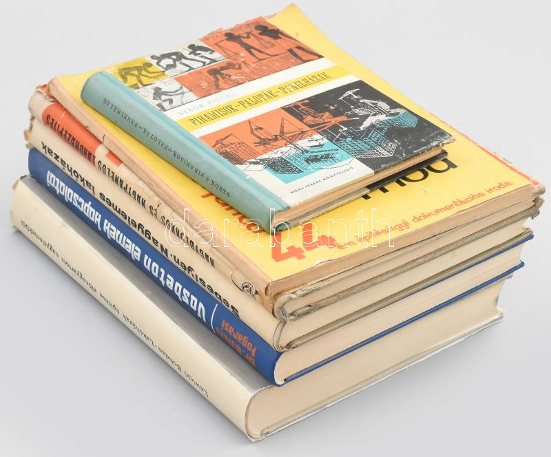 Vegyes paneles házakkal kapcsolatos könyvtétel, 6 db: Lewicki Bohdan: Lakóházak épÃtése elÅ‘regyártott nagyelemekbÅ‘l. Méretezés és szerkesztés. Bp., 1965, Műszaki. Megjelent 1350 példányban.; Balázs György - Fogarasi Gyula: Vasbeton elemek kapcsolatai. Bp., 1977., Műszaki.; Sebestyén Gyula: Nagyelemes lakóházak. Bp., 1960., Műszaki.; Megjelent 1600 példányban.; VladimÃr JurÃk: Nagyblokos és nagypanelos lakóházépÃtés. Bp., 1960., Műszaki. Megjelent 1100 példányban.; Rikker Mihály - Juhász Ferenc: Panelos épÃtési mód. Munkatervezés 333. Bp.,1965., ÉM ÉpÃtésügyi Dokumentációs Iroda. Megjelent 500 példányban.; SebÅ‘k Ferenc: Piramisok, paloták, panelházak. Búvár Könyvek 20. Bp., 1961., Móra. Különféle kötésekben. Változó állapotban.