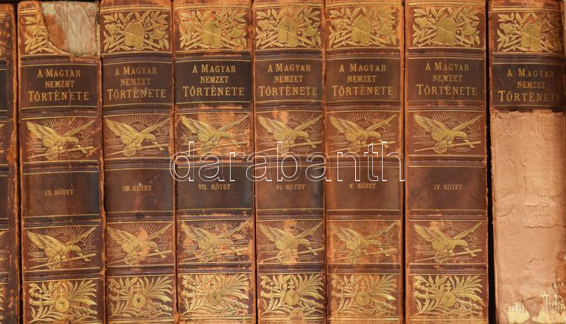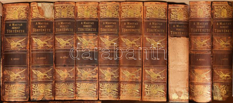 A magyar nemzet története. I-X.. köt. Teljes! Szerk. Szilágyi Sándor. Írták: Acsády Ignác, Angyal Dávid, Ballagi Géza, Beksics Gusztáv, Fraknói Vilmos, Marczali Henrik... Bp. 1895-1898. Athenaeum.. Rendkívül gazdag illusztrációs anyaggal, színes táblákkal kihajtható fakszimilékkel, szövegközti és önálló képekkel. Aranyozott, kiadói félbőr-kötésben, nagyrészt sérült gerincekkel, de belül jó állapotban.