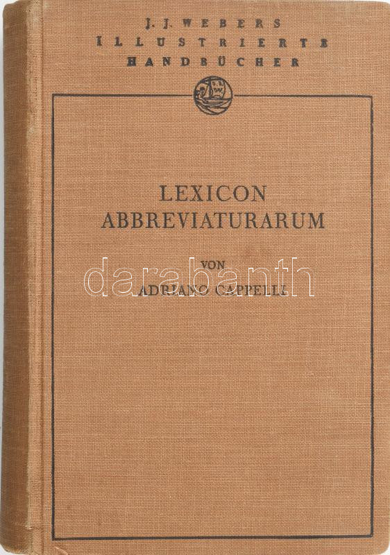 Beschreibung: Adriano Capelli: Lexicon Abbreviaturarum. Wörterbuch lateinischer und italienischer Abkürzungen, wie sie in Urkunden und Handschriften besonders des Mittelalters gebräuchlich sind, dargestellt in über 14000 Holzschnittzeichen. Lipcse, 1928, Weber. 2. kiadás. Német nyelven. Kiadói egészvászon-kötésben, hátsó szennylap feltehetően hiányzik, máskülönben jó állapotban..