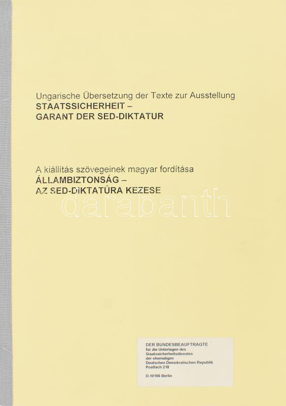 Állambiztonság. Az SED-diktatúra kezese (a kiállítás szövegeinek magyar fordítása). É.n., Berlin. Magyar és német nyelven. Fénymásolt lapok, félvászon kötésben.
