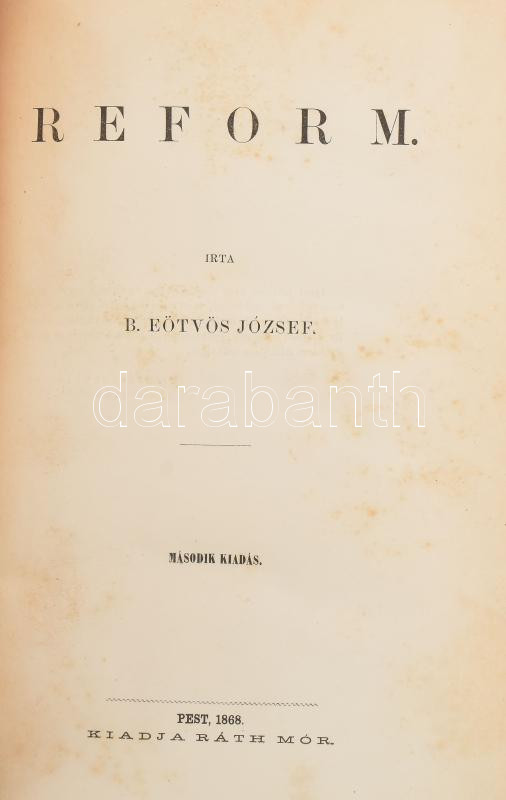 B. Eötvös József: Reform. Pest, 1868., Ráth Mór, (Kocsi Sándor-ny.), 6+228 p. Második kiadás. Félvászon kötésben. A szerző Széchenyi és Kossuth vitájában az utóbbi pártjára állt. Amikor a Pesti Hirlap főszerkesztője barátja, Szalay László lett, itt jelentette meg a parlamentáris kormányzás mellett érvelő cikksorozatát. Ezeket foglalta egybe önállóan e kötetben. Éry ( Emil (1893-1976): tanár, középiskolai igazgató, a Magyar Cserkészszövetség elnökének ex librisével.