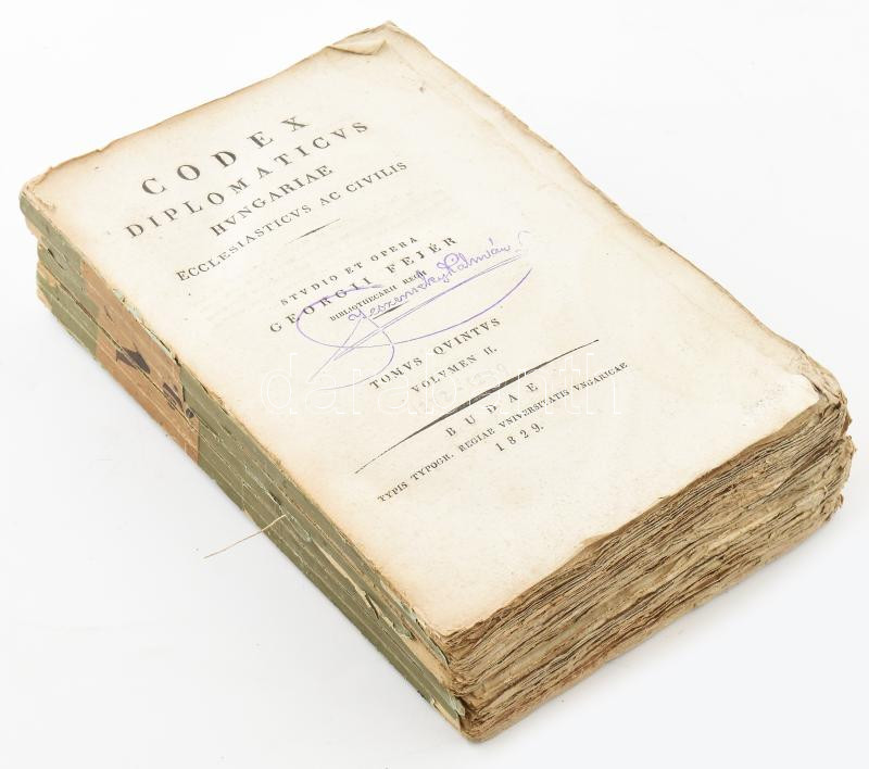 [Fejér György] Georgius Fejér: Codex Diplomaticus Hungariae ecclesiasticus ac civilis. Tomus Quintus. Vol. II. Studio et Opera Georgii Fejér bibliothecarii regii. Budae, 1829, Typis Typogr. Regiae Universitatis Ungaricae, 608 p. Latin nyelven. Kiadói papírkötésben, első borító nélkül Kisjeszeni Jeszenszky Kálmán katolikus pap, a Madách Társaság elnöke pecsételt ex librisével.