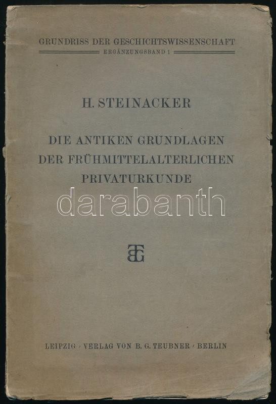 Harold Steinacker: Die antiken Grundlagen der frühmittelalterlichen Privaturkunde. Lipcse-Berlin, 1927, B. G. Teubner. 171 p. Német nyelven. Kiadói papírkötés, sérült és részben javított gerinccel, saraiban kissé sérült borítóval, néhány lapon ceruzás jegyzetekkel.