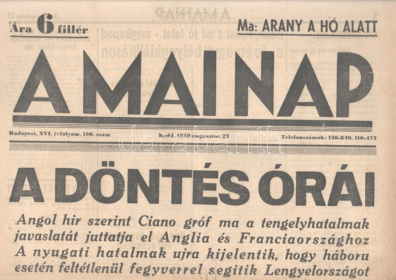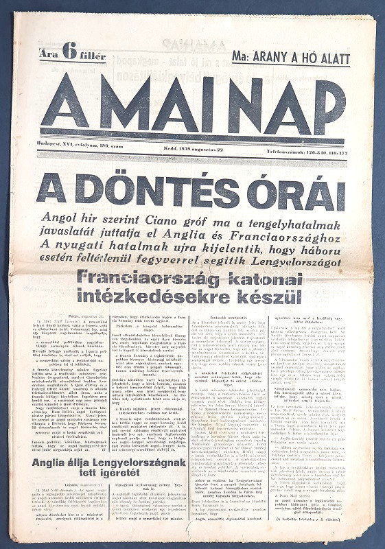[II. Világháború] A Mai Nap. 1939. augusztus 22. (Napilap, XVI. évfolyam, 190. szám) "A döntés órái --- Angol hir szerint Ciano gróf ma a tengelyhatalmak javaslatát juttatja el Anglia és Franciaországhoz -- A nyugati hatalmak újra kijelentik, hogy háboru esetén feltétlenül fegyverrel segitik Lengyelországot -- Franciaország katonai intézkedésre készül." Félbehajtva, jó állapotban.