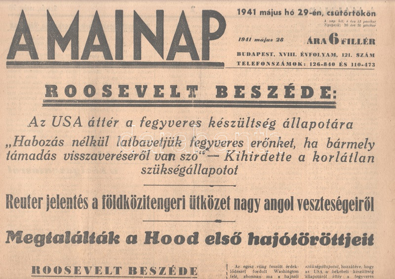 [II. Világháború] A Mai Nap. 1941. május 29. (Napilap, XVIII. évfolyam, 121. szám) "Roosevelt beszéde: Az USA áttér a fegyveres készültség állapotára -- Reuter jelentés a földközitengeri ütközet nagy angol veszteségeiről -- Megtalálták a Hood első hajótöröttjeit." Félbehajtva, jó állapotban.