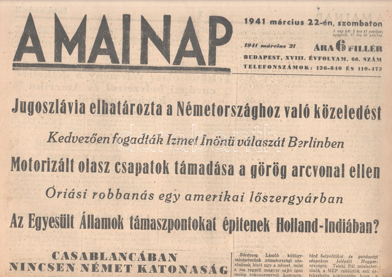 [II. Világháború] A Mai Nap. 1941. március 22. (Napilap, XVIII. évfolyam, 66. szám) "Jugoszlávia elhatározta a Németországhoz való közeledését -- Kedvezően fogadták Izmet Inönü válaszát Berlinben -- Motorizált olasz csapatok támadása a görög arcvonal ellen -- Óriási robbanás egy amerikai lőszergyárban -- Az Egyesült Államok támaszpontokat építenek Holland-Indiában?-- Casablancában nincsen német katonaság." Félbehajtva, jó állapotban.